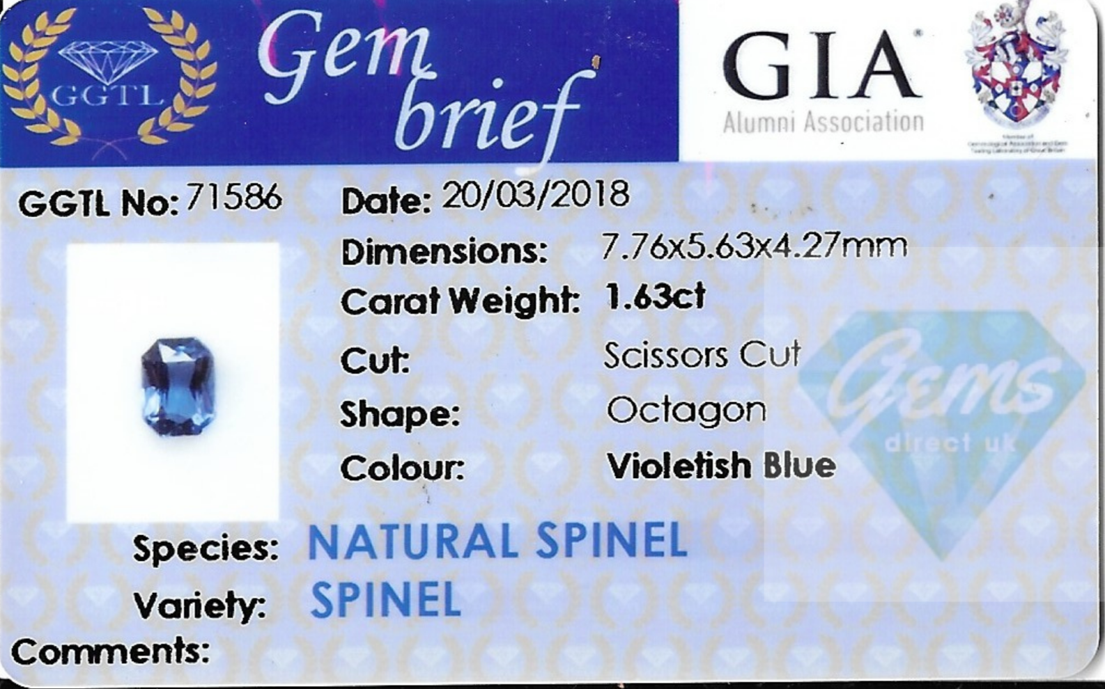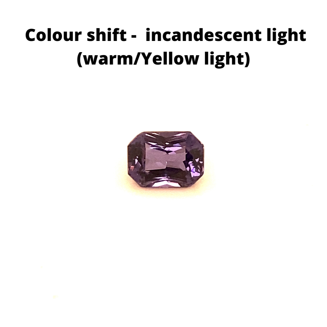 Comment - Violetish Blue Spinel. This stone exhibits a colour shift to a more Purple colour in incandescent light